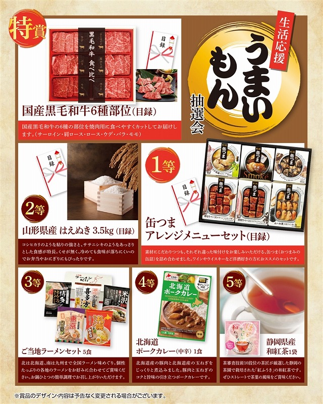 180日(残日数60日以上)※目録賞品を除く [特賞]国産黒毛和牛6種部位 (目録)・・・30日間(冷凍) [1等]缶つまアレンジメニューセット(目録)・・・3年間(常温) [2等]山形県産 はえぬき 35kg (目録)・・・精米日より約130日間(常温) [3等]ご当地ラーメン5食セット・・・180日間(常温) [4等]北海道ポークカレー(中辛)1食 ・・・2年間(常温) [5等]静岡県産和紅茶1袋・・・365日間(常温)