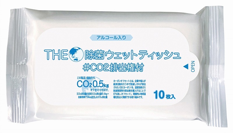 スタンダードなアルコールタイプのウェットティッシュ。二酸化炭素の削減に間接的に貢献できます。