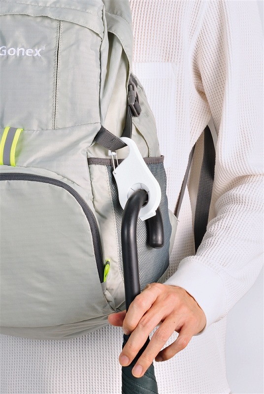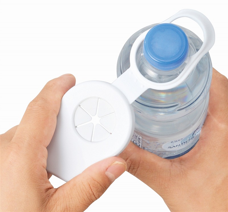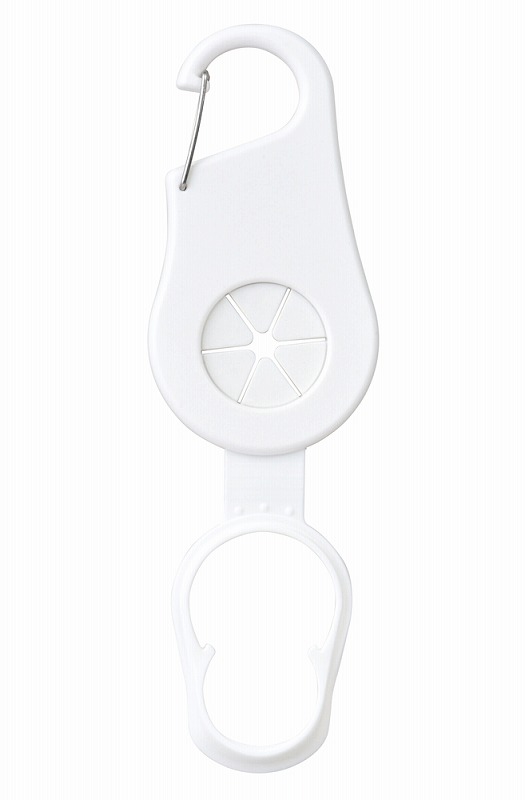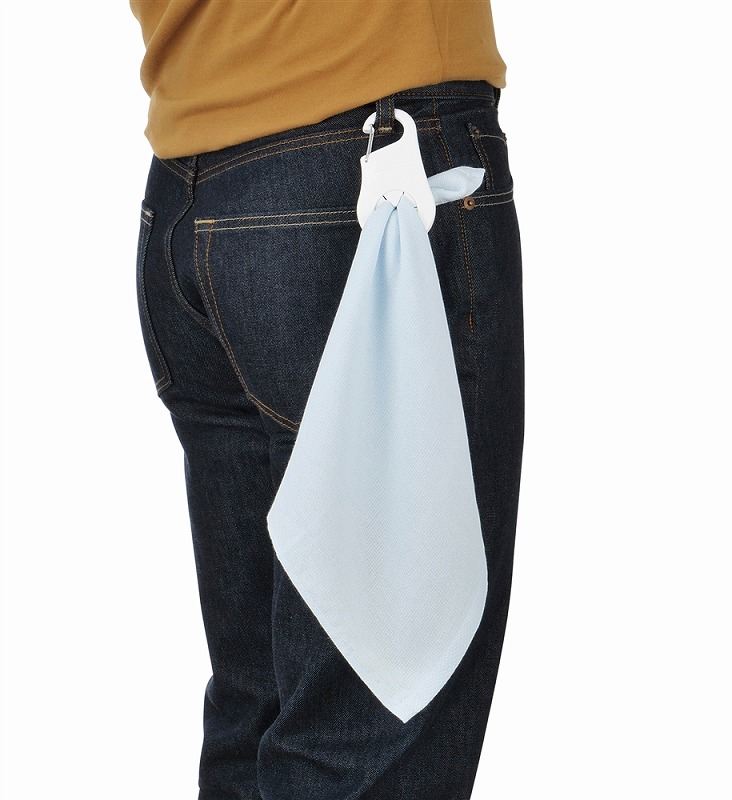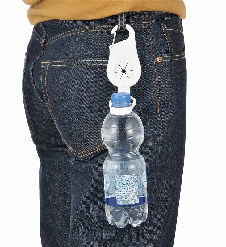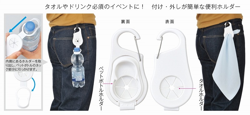 内側にあるホルダーを取り出し、ペットボトルのネック部分に引っかけて使用します。タオルは先端をホルダーに押し込んで使用します。バッグやベルトループに取り付けられるので身軽に動けます。