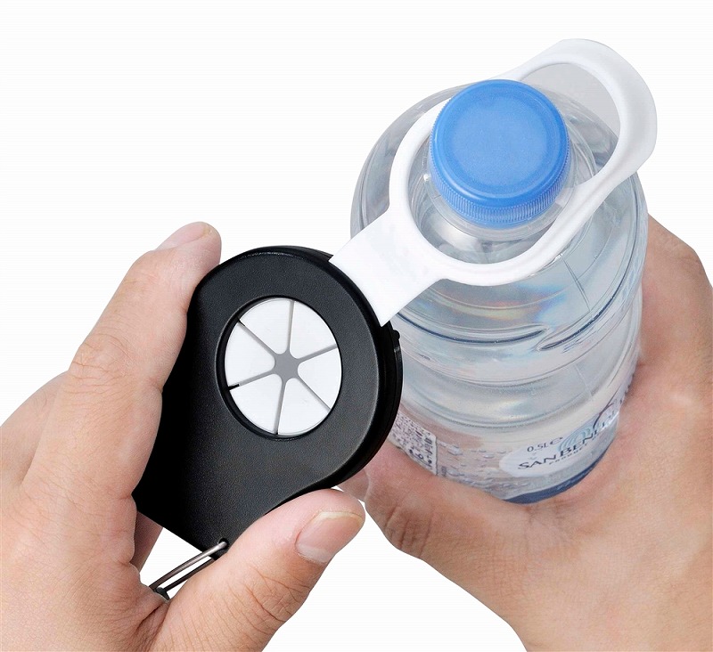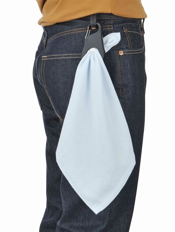 内側にあるホルダーを取り出し、ペットボトルのネック部分に引っかけて使用します。タオルは先端をホルダーに押し込んで使用します。バッグやベルトループに取り付けられるので身軽に動けます。