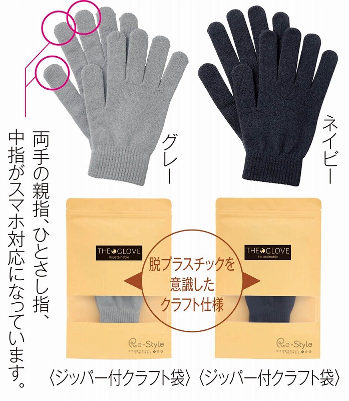 SDGsの目標14「海の豊かさを守ろう」につながる、プラスチック削減や3R+Renewableに該当する素材を使用したアップサイクルなタッチグローブです。 GRS・・・グローバル・リサイクルド・スタンダードは国際的で自発的な完全製品基準であり、リサイクル材の第3者認証、流通管理、社会及び環境的、且つ化学的影響が最小化される事を保証する要件を定義しています。