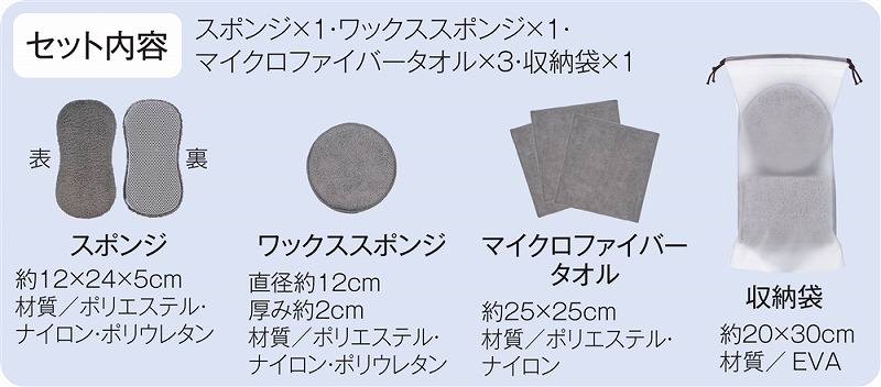 スポンジ/約12×24×5cm ワックススポンジ/直径約12cm 厚み約2cm マイクロファイバータオル/約25×25cm 収納袋/約20×30cm