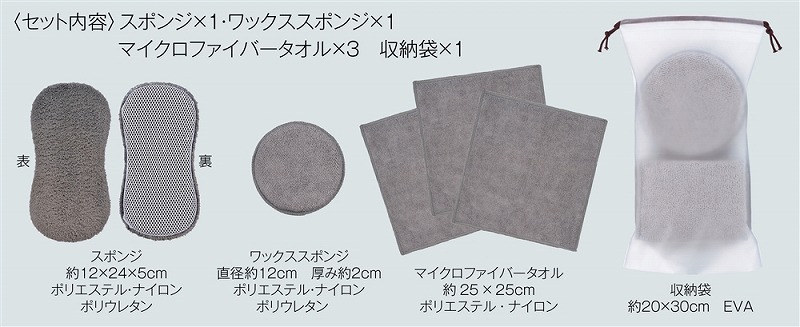 スポンジ/ポリエステル・ナイロン・ポリウレタン ワックススポンジ/ポリエステル・ナイロン・ポリウレタン マイクロファイバータオル/ポリエステル・ナイロン 収納袋/EVA