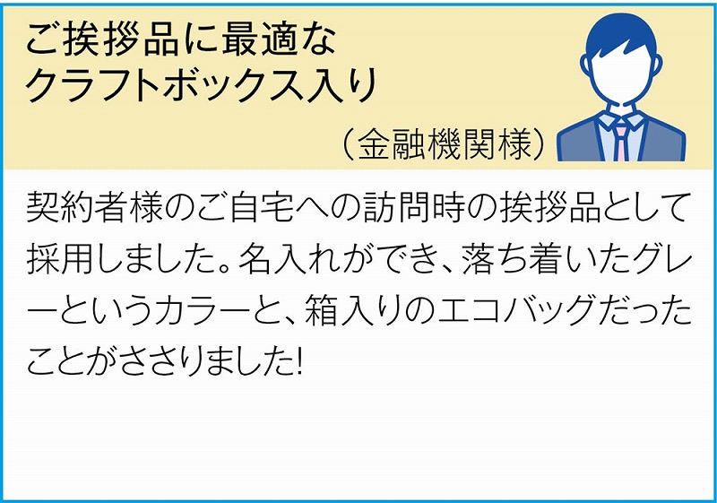 たっぷり入る肩掛けタイプ。個包装には名刺が差せるクラフトボックスを使用しています。