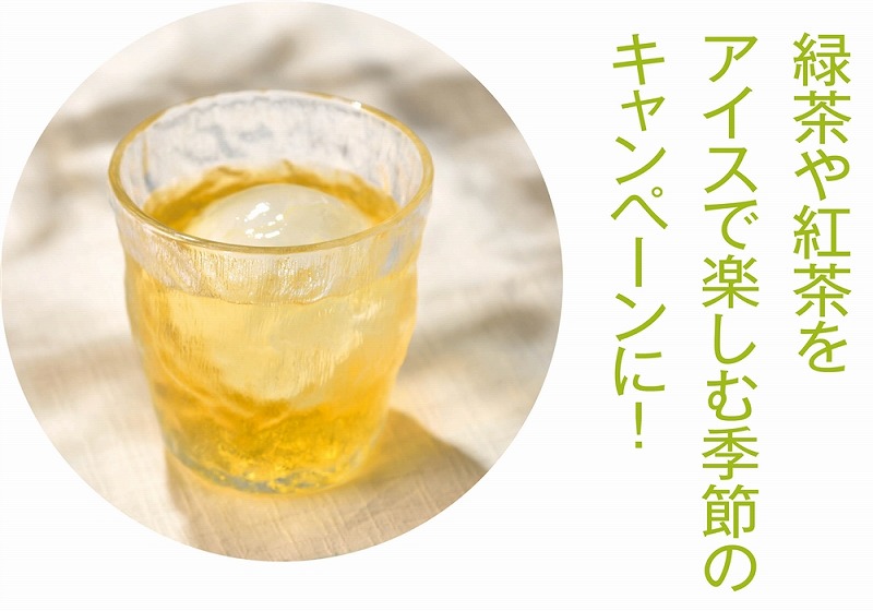 ゆっくり時間をかけて溶ける丸氷は、お酒本来の味を長く楽しめます。緑茶や紅茶をアイスで楽しむ季節のキャンペーンにも!