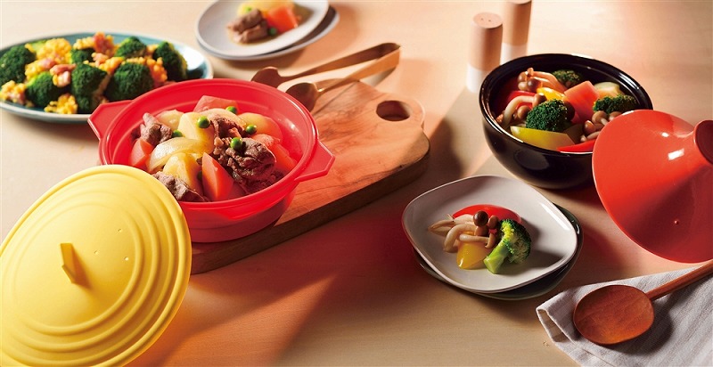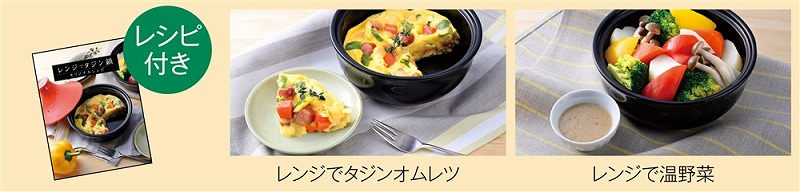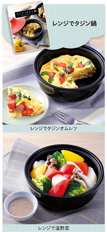 食材のうまみや栄養素を逃さない無水調理をレンジでカンタンに!そのまま食卓に出せる陶器製。あと一品作りたい、そんな時にあると便利なお役立ちグッズ!!野菜をたくさん摂れる「タジンオムレツ」と「温野菜」のレシピ付き。