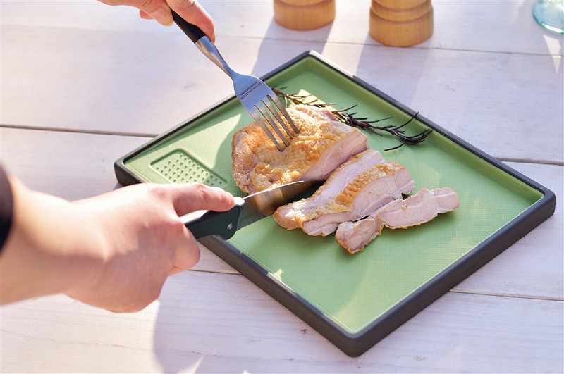 食材を切る時にキュッと固定できるすべり止め/食材のドリップや切った野菜などを受け止める傾斜/便利な薬味おろし/など機能が満載!両面仕様なので肉と魚で使い分ける、といった事も可能です。 個包装の持ち手付ジッパー袋はアウトドアなどの持ち歩き時に再利用していただけます。