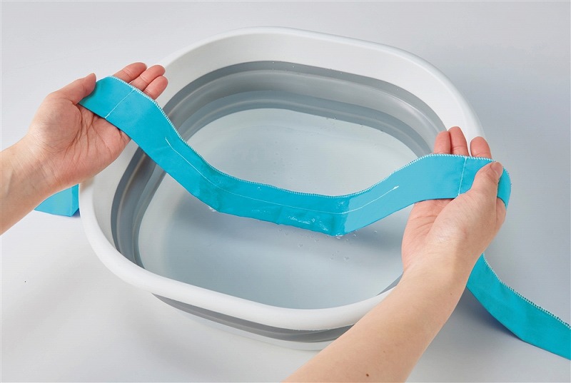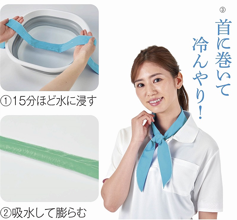 中央部分の吸水性ポリマーが膨らめばひんやり気持ちいい。15分ほど浸してからご使用ください。