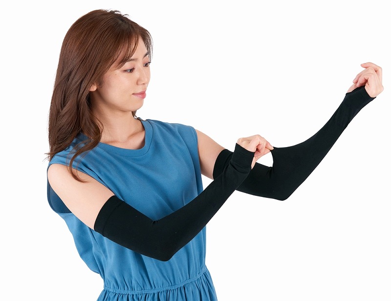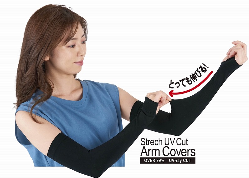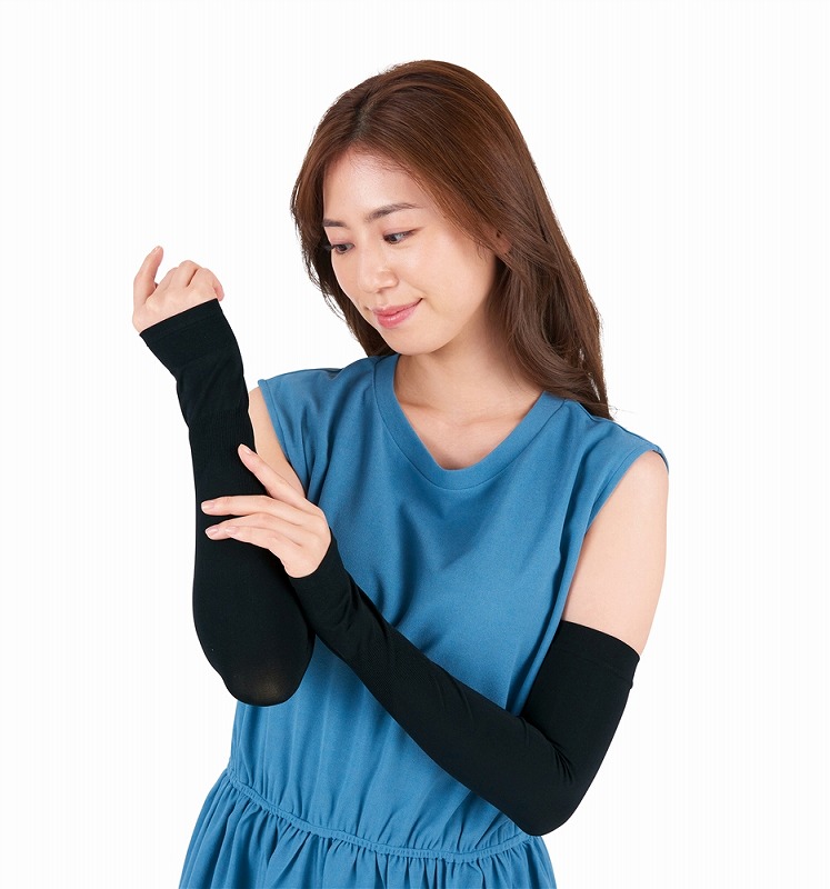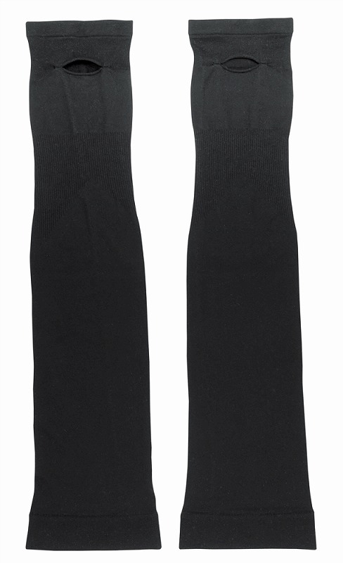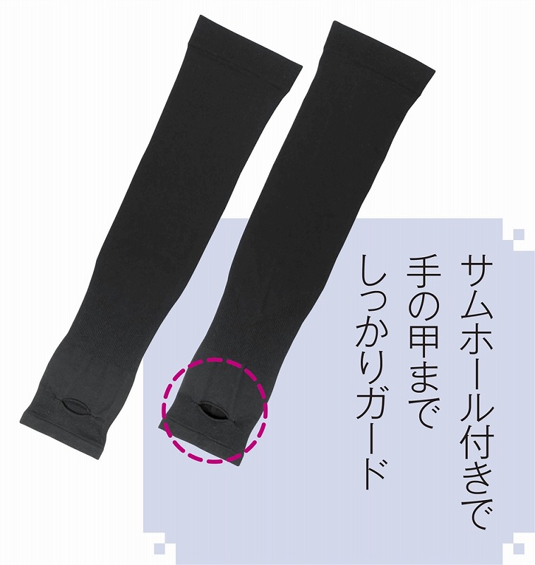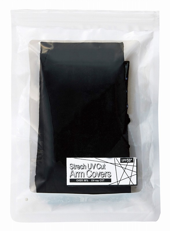 シンプルなオールブラックのUVカットアームカバー。サムホール付きで手の甲までしっかりガードします。持ち歩きや保管にも便利なジッパーバッグ入り。※UPF・・・UltraViolet Protection Factorの略。衣類が紫外線を防ぐ効果を示す指標。「UPF50+」は最も効果が高い表記です。