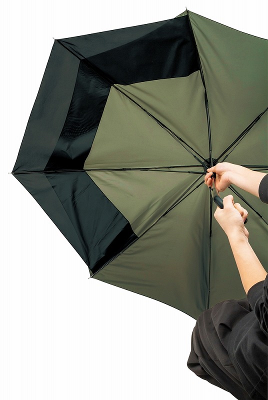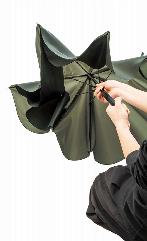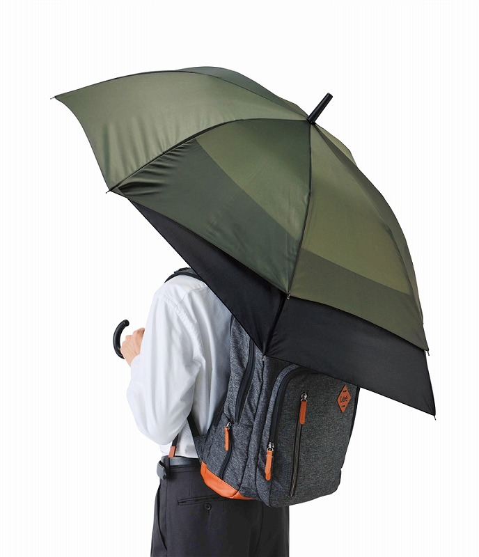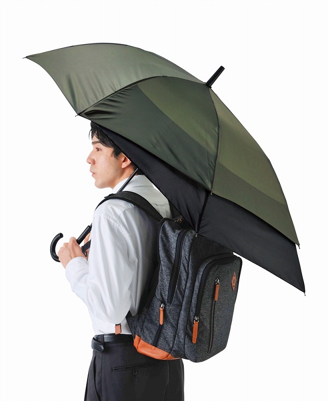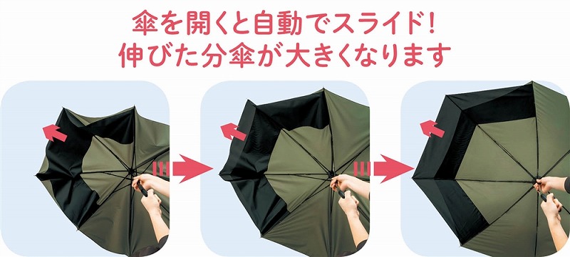 通常の傘のように開くと後ろの部分の生地も同時に約12cm広がるので、大きな荷物やお子様をおんぶしている時も雨からガード。