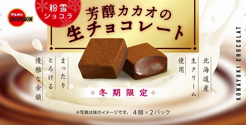 こくのある生クリームと芳醇なカカオの味わいが広がる、くちどけなめらかな生チョコレートです。この時期だけのおいしさをお楽しみください。生地の厚みを115%アップし、柔らかい噛み出しと芳醇なカカオの風味が味わえる生チョコレートです。パッケージデザインを一新し、高級感と、生地のシズルから生チョコのとろけるおいしさを伝えます。