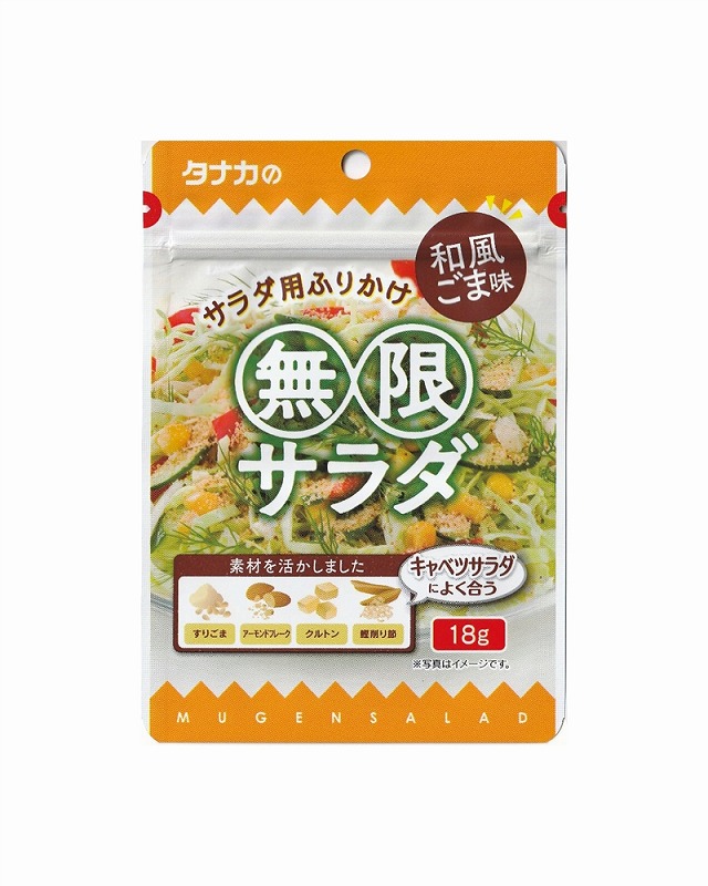 サラダ45gに対して、本品6g(大さじ1)をふりかけて、よく混ぜてください。まんべんなく味がなじんだら「無限サラダ」のできあがり!すりごまやごまの風味が口いっぱいに広がります。