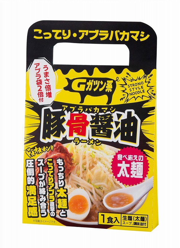 市場で人気の商品を連想させる特徴的な黄色と黒のパッケージ。付属のアブラ袋を1個増量した食べ応えのある豚骨醤油ラーメン。わかってはいるけどやめられない背徳感満載の一品です。お好みでトッピングも増量することで、より一層楽しめます。