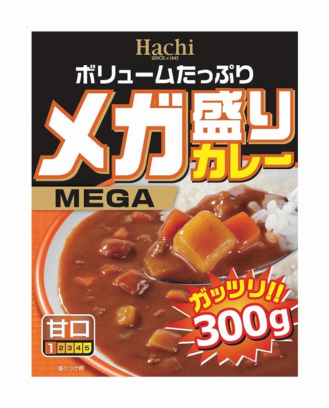 1845年に創業の日本で初めてカレー粉を国産化したハチ食品が作ったレトルトカレー。売れ筋のメガ盛りシリーズ。一人前300gの超大盛りタイプ。子供から大人まで楽しめる甘口を是非、皆で楽しんでください。