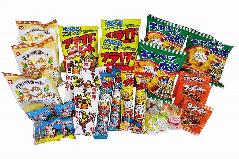 [セット内容] キャベツ太郎30個 玉葱さん太郎30個 フライドポテト30個 餅太郎60個 ラーメン屋さん太郎60個 クッピーラムネ100個 フルーツキャンディ100個 コーンポタージュ30個 星の国みつけた50個 うまい棒(2種)計60個