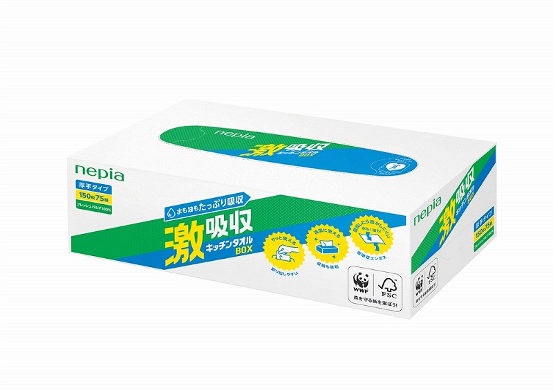 ・厚手タイプで、水も油もたっぷり吸収。 しかもロールタイプと同じ激吸収エンボス加工。 ・FSC認証紙を採用。