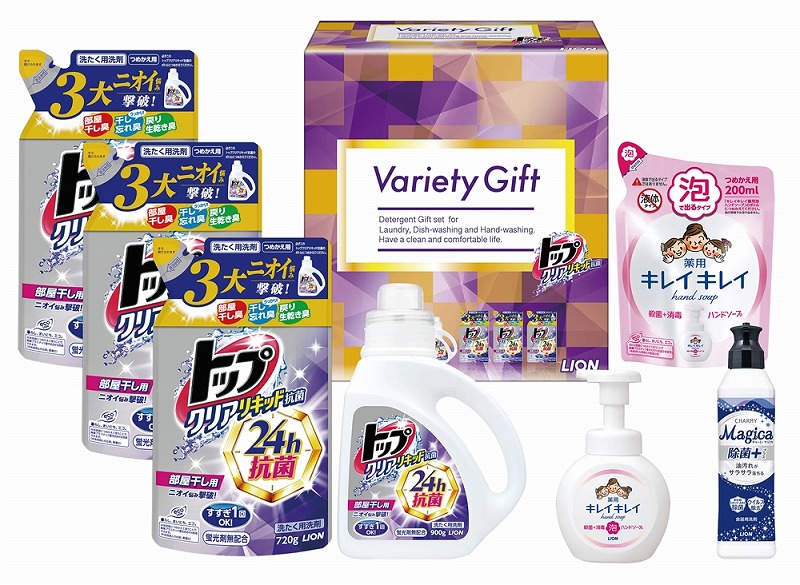 [セット内容] ●トップクリアリキッド抗菌 900g×1 ●トップクリアリキッド抗菌720g(詰め替え用)×3 ●CHARMY Magica除菌+(プラス)220ml×1 ●キレイキレイ薬用泡ハンドソープ250ml×1 ●キレイキレイ薬用泡ハンドソープ 200ml(詰め替え用)×1 ※ライオン製品各種取混ぜ2カートン以上にてお申し込みください。