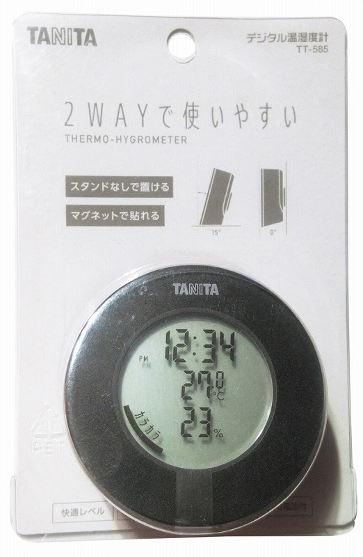 快適度を表示。 過去の最高・最低温湿度を表示。 インテリアに馴染む丸型のデザイン。 置き式では傾斜がつき、マグネット使用時は傾斜がなくなる使い勝手のよい形状。 小型設計。