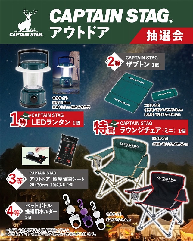 [キット内容] [特賞]CAPTAIN STAG ラウンジチェア(ミニ) ・・・1本 [1等]CAPTAIN STAG LEDランタン・・・2本 [2等]CAPTAIN STAG ハンディコンテナ・・・3本 [3等]CAPTAIN STAG ザブトン・・・4本 [4等]ペットボトル携帯用ホルダー・・・90本 [付属] 抽選くじ×100、くじ明細書×1、抽選箱×1、告知用A3ポスター×1 ※賞品の内容・デザインは画像と異なる場合があります。あらかじめご了承ください。