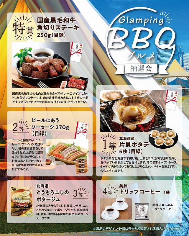 [キット内容] [特賞]国産黒毛和牛角切りステーキ250g(目録)・・・1本 [1等]北海道産 片貝ホタテ5枚(目録)・・・1本 [2等]ビールにあうソーセージ270g(目録)・・・2本 [3等]北海道 とうもろこしのポタージュ3袋入・・・6本 [4等]美鈴 ドリップコーヒー 1袋 ・・・90本 [付属] 抽選くじ×100、くじ明細書×1、抽選箱×1、告知用A4カード×1 ※賞品の内容・仕様は予告なく変更となる場合がございます。
