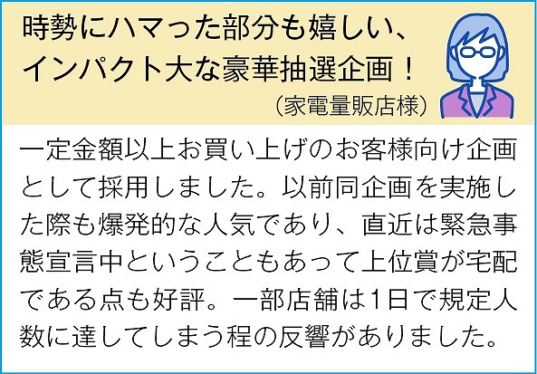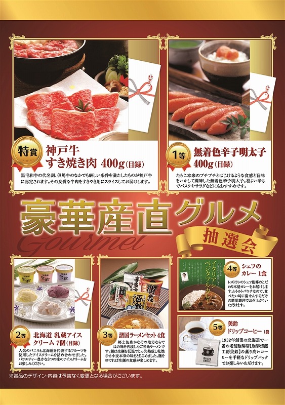 [キット内容] [特賞]神戸牛すき焼き肉400g(目録)・・・1本 [1等]無着色辛子明太子 400g(目録)・・・1本 [2等]北海道 乳蔵アイスクリーム7個(目録)・・・2本 [3等]諸国ラーメンセット4食・・・3本 [4等]シェフのカレー1食・・・5本 [5等]美鈴ドリップコーヒー1袋・・・88本 [付属品] 抽選くじ×100、抽選箱×1、くじ明細書×1、告知用A4カード×1 ※特賞~2等までの各目録には、下記付属品がございます。 ・A4判POP1枚(スタンド式セルケース入) ・目録封筒1部 ・商品交換用ハガキ1枚 (有効期間は納品後約180日間です) ・個人情報保護シール1枚 ・商品の説明テキスト ※賞品の内容・仕様は予告なく変更となる場合がございます。
