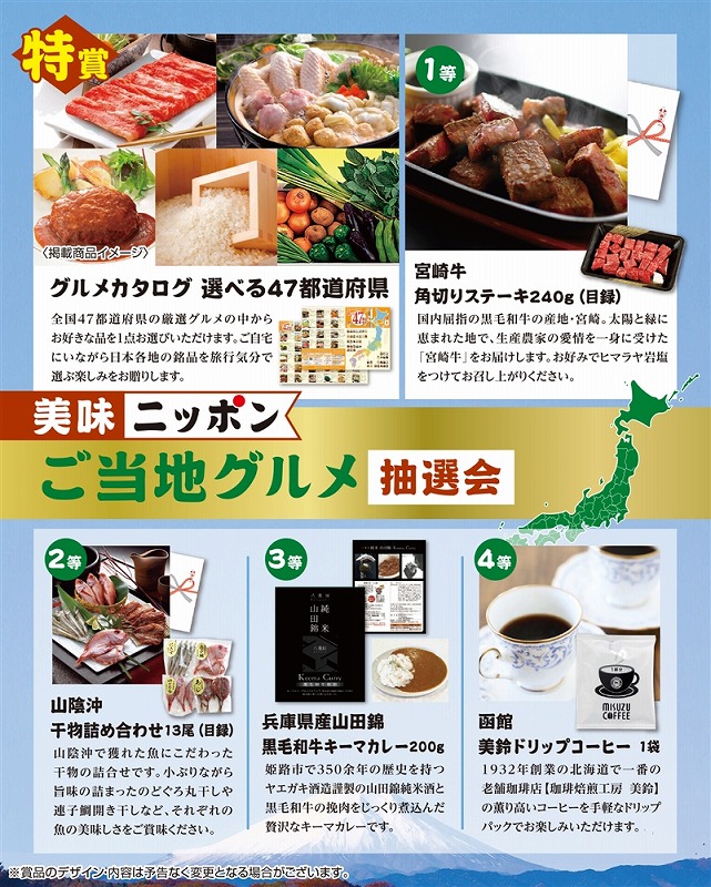 [キット内容] [特賞]グルメカタログ 選べる47都道府県・・・1本 [1等]宮崎牛 角切りステーキ240g(目録)・・・1本 [2等]山陰沖 干物詰合せ13尾(目録)・・・1本 [3等]兵庫県産山田錦黒毛和牛キーマカレー・・・2本 [4等]函館美鈴 ドリップコーヒー 1袋 ・・・25本 [付属] 抽選くじ×30、抽選箱×1、くじ明細書×1、告知用A4カード×1 ※特賞のグルメカタログの有効期間はカタログ出荷時から約180日間です。 ※賞品の内容・デザインは画像と異なる場合があります。あらかじめご了承ください。