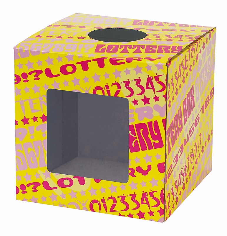 1辺27cmの紙製抽選箱。中の様子が見える透明窓付き