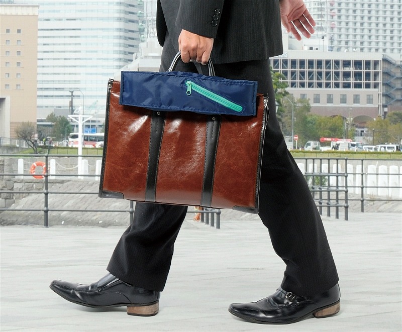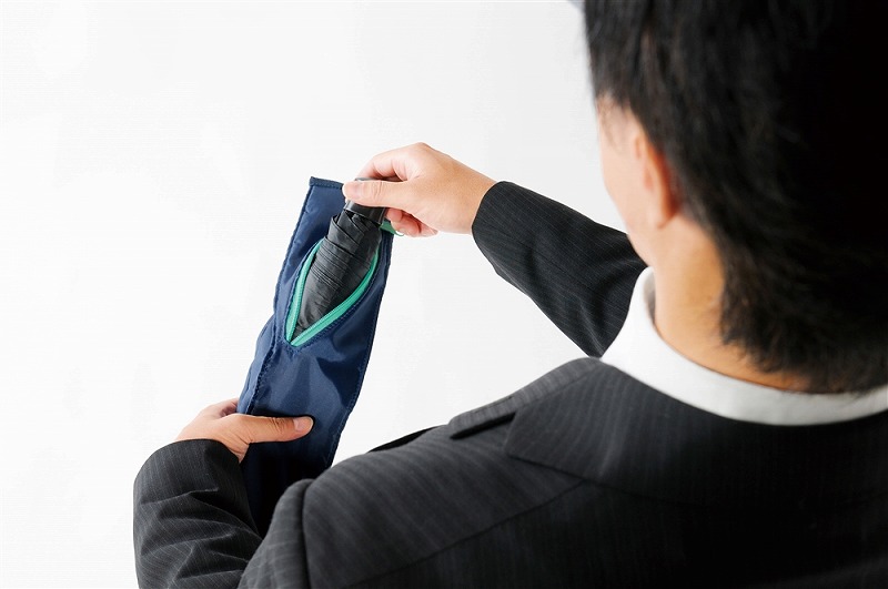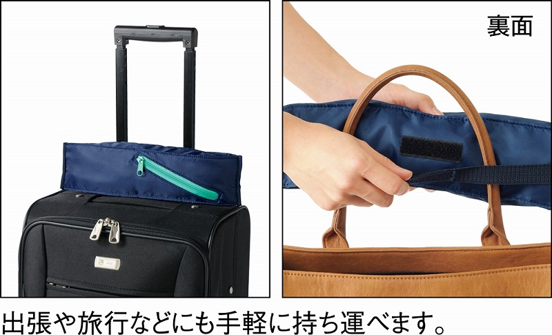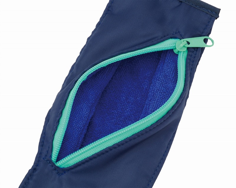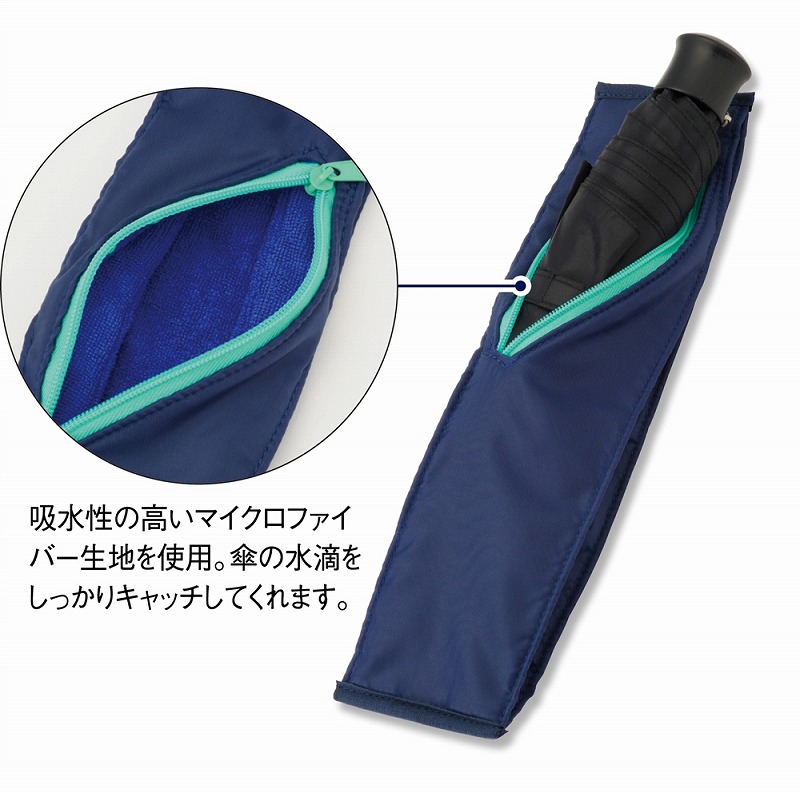 バッグの取っ手に取り付けておけるので出し入れもスムーズ。内側のマイクロファイバーで水滴もしっかり吸い取ります。