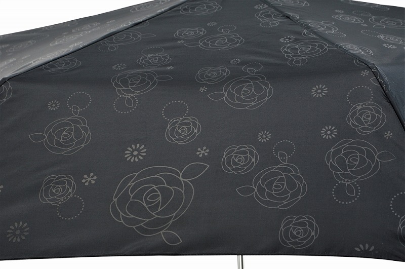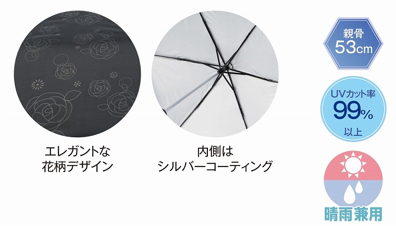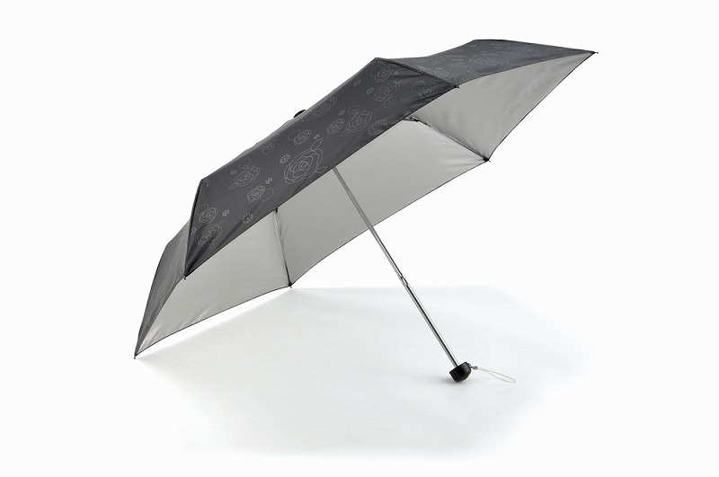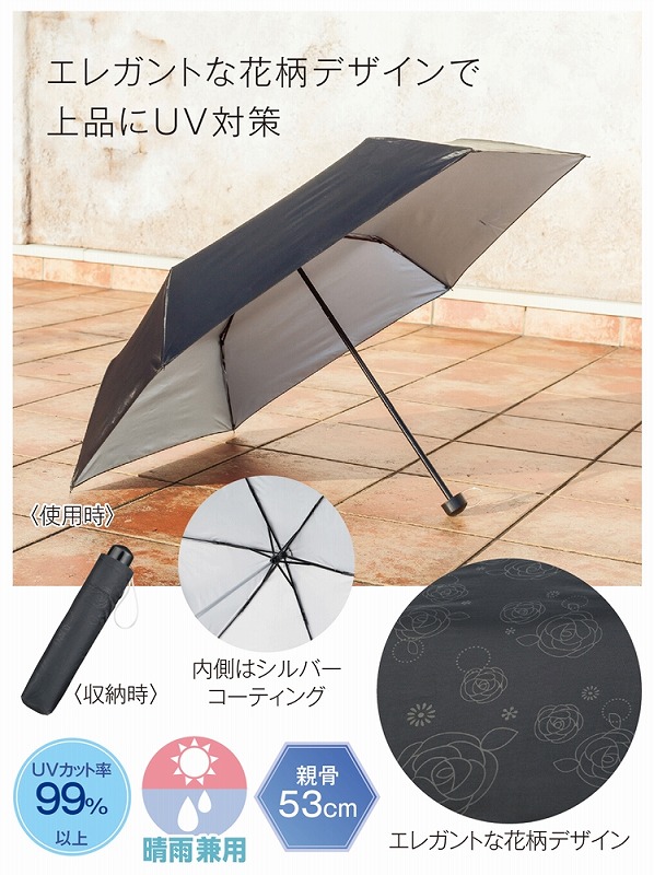 ブラック×花柄のベーシックな折りたたみタイプ。内側シルバーコーティングでUVカット率は安心の99%以上。 春先からの早めのUV対策が今や常識。お出かけの機会が増えてくる季節のマストアイテムです。