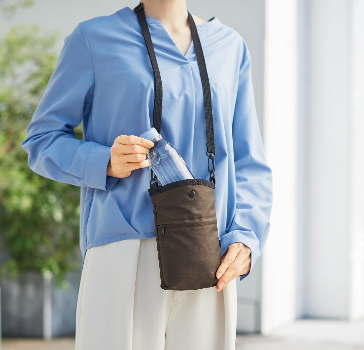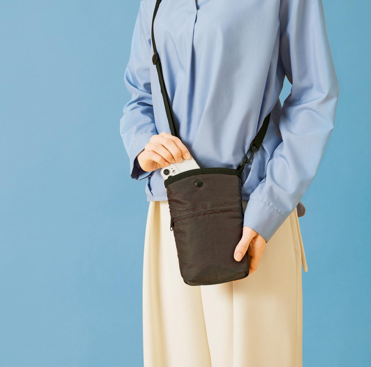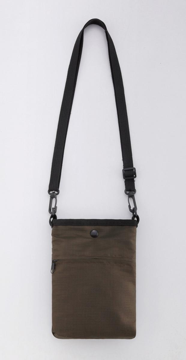 スマホやドリンク類をお洒落に持ち運べる、タフさが特徴のテント生地仕様ショルダー。