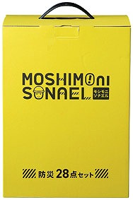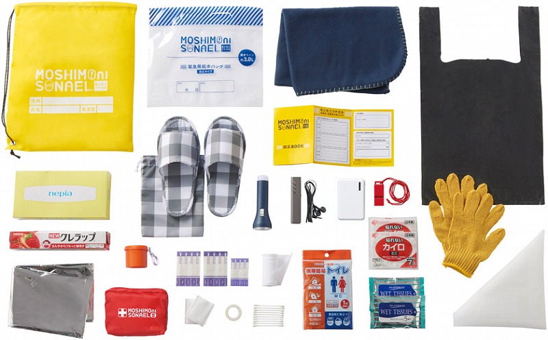セット内容/持出袋・給水バッグ3L・LEDライト・ホイッスル・アルミシート1200×800mm・グローブ・ウェットティッシュ×2・ポリ袋×3・防災ブック・ばんそうこう大×4・小×2・カット綿×6・綿棒×10・三角巾・テープ・包帯・ポーチ・携帯簡易トイレ・ブランケット・モバイルバッテリー5000mAh・FMポケットラジオ・使いきりカイロ×2・キッチンラップ・BOXティッシュ・携帯スリッパ・レインポンチョ、FMポケットラジオ/単四乾電池2本使用(別途)・ライト/単三乾電池1本使用(別途)
