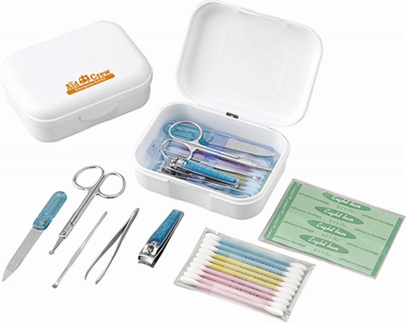 専用ケース、キズテープM(3枚入り)(日本)、グルーミング5点セット(爪切り、エチケットハサミ、耳かき、爪ヤスリ、毛抜き兼ピンセット)(中国)、カラー綿棒(10本入り)(タイ)