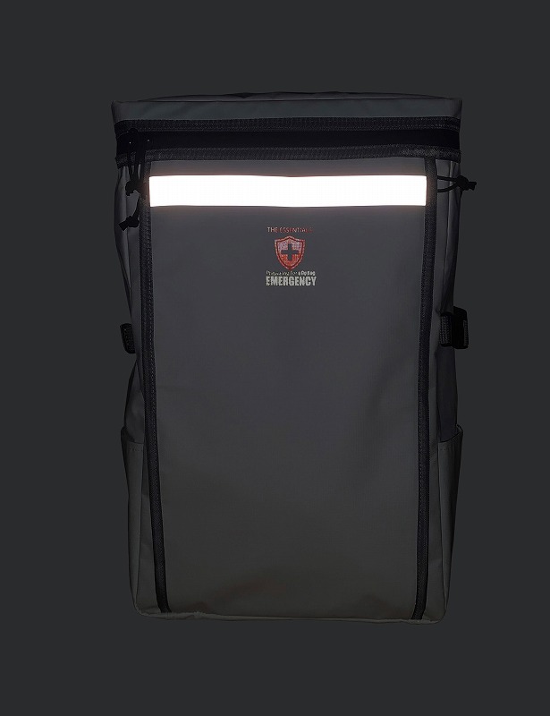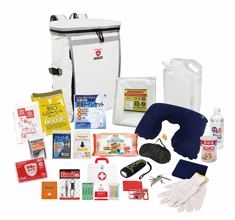 収納リュック・防災の心得・IDホイッスル&カラビナリング・カイロ・レインコート・抗菌消臭簡易トイレ3回分・トイレポンチョ・ダイナモ多機能ライト・軍手・静音アルミブランケット・救急てぬぐい・からだふき・ネックピロー・アイマスク・耳栓・レジャーシート・5年保存水500ml・カンパン100g・8徳ナイフ・ウォーターバッグ3L・ソーイングセット・救急4点セット・45Lゴミ袋3P