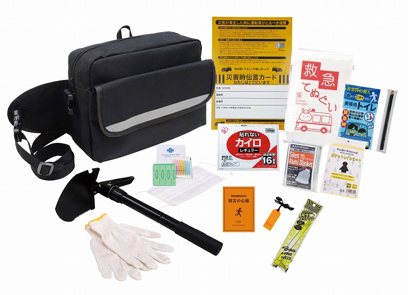 収納バッグ・災害時伝言カード・救急てぬぐい・携帯用トイレ1P・綿棒&バンソウコウ・マスク・カイロ・静音アルミブランケット・レインコート・防災の心得・ホイッスル・発光スティック・ダーマト鉛筆・マルチショベル・軍手