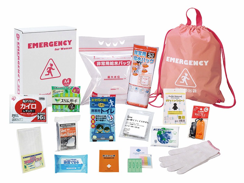 非常用持出袋・防災の心得・ホイッスル・カイロ・レインコート・携帯用トイレ1P・軍手・生理用ナプキン(8枚入)・静音アルミブランケット・使い捨てフェイスタオル・綿棒&バンソウコウ・マスク・給水袋3L・除菌アルコールウェットティッシュ・水に流せるペーパー