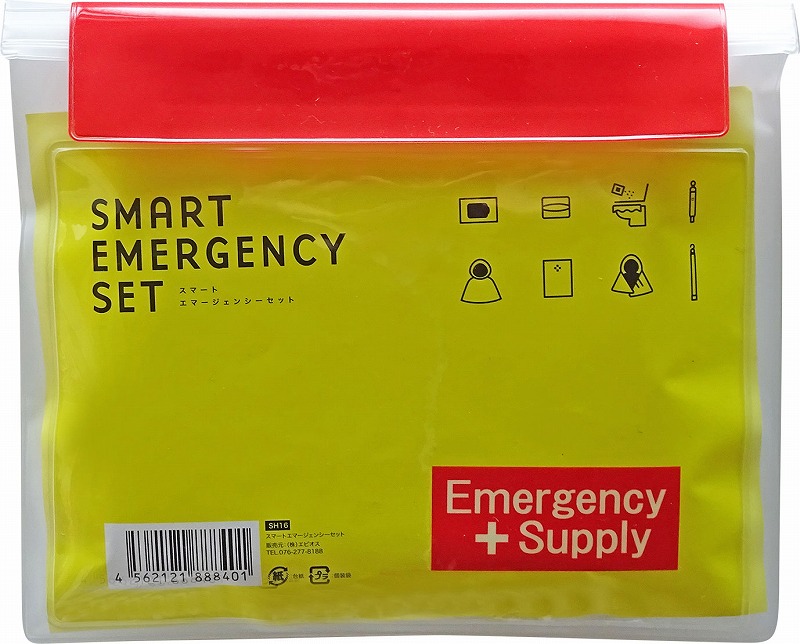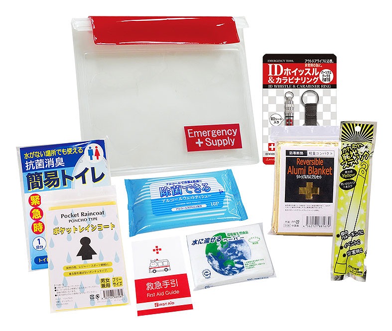 防水ポーチ・IDホイッスル&カラビナリング・除菌アルコールウェットティッシュ・リバーシブルアルミブランケット・レインコート・水に流せるペーパー・抗菌消臭簡易トイレ・救急手引・かんたん発光スティック