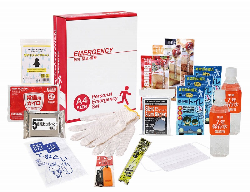 バランススティック×3・7年保存水500ml×2・携帯用トイレ1P×3・静音アルミブランケット・防災用ウェットティッシュ・軍手・発光スティック・カイロ・ホイッスル・マスク・レインコート・防災てぬぐい