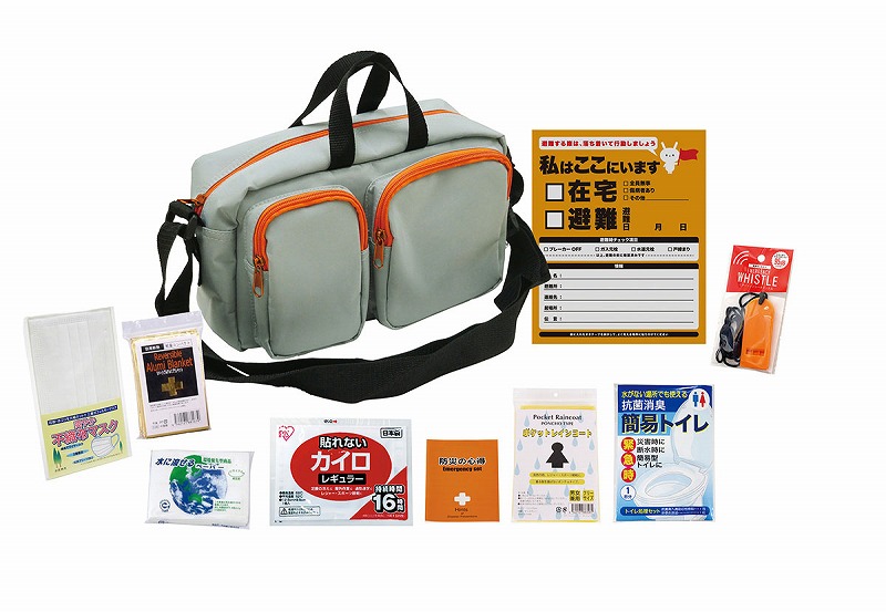 収納ショルダーバッグ・防災の心得・ホイッスル・カイロ・レインコート・抗菌消臭簡易トイレ1P・アルミブランケット・マスク・緊急避難カード・水に流せるペーパー