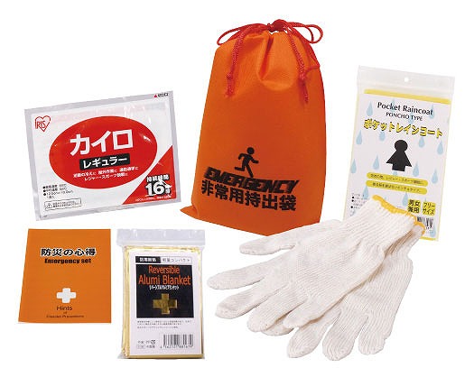 収納巾着袋・アルミブランケット・軍手・レインコート・使い捨てカイロ・防災の心得