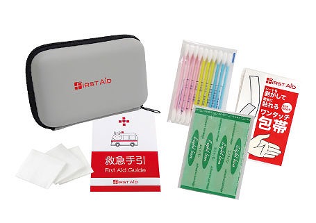 収納ケース・絆創膏5P・ワンタッチ包帯・コットンパフ3P・綿棒10P・救急手引