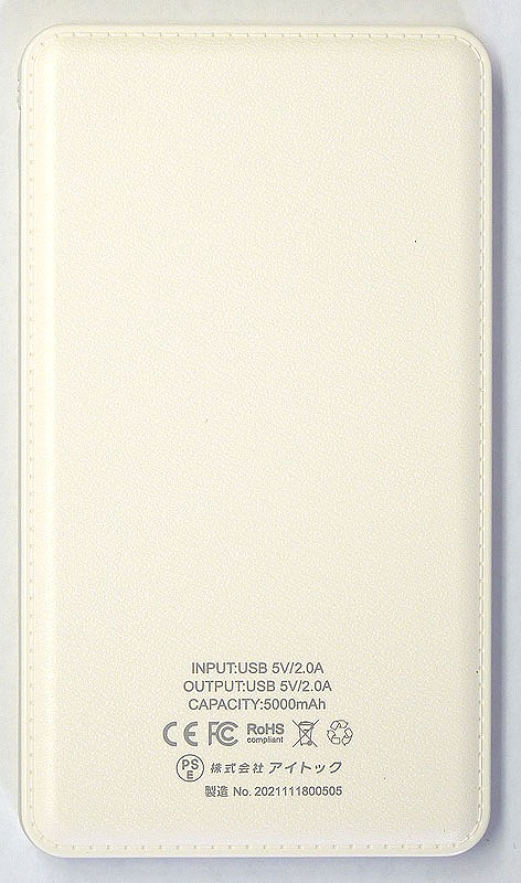 ・定格容量等:バッテリー容:量5000mAh(18.5Wh)、出力:5V/2A、入力:5V/2A