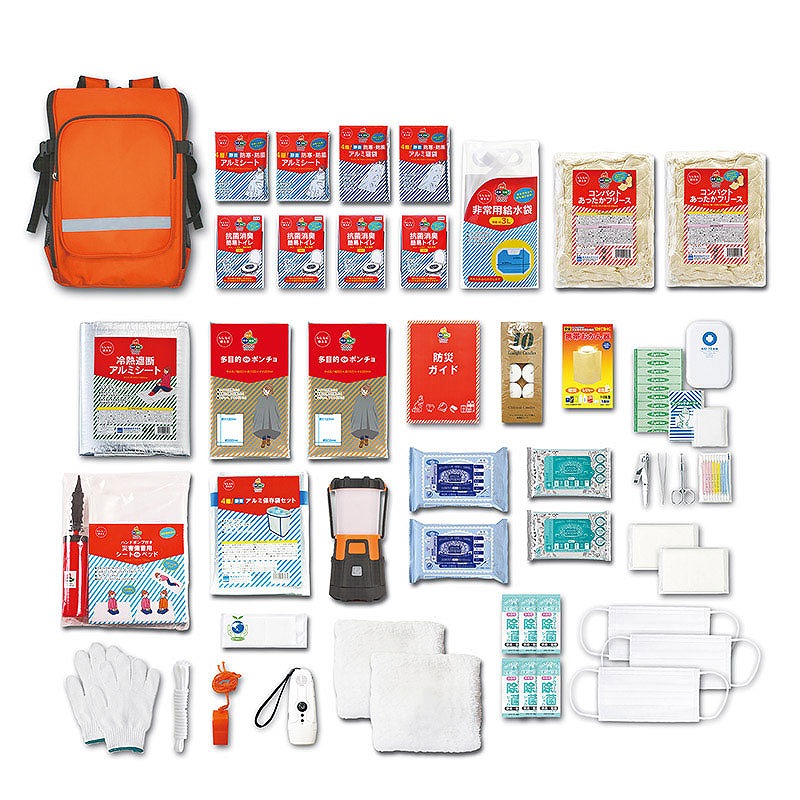 セット内容:(1)大きく開くdeリュック、(2)(3)4層!静音 防寒・防風アルミシート×2、(4)(5)4層!静音 防寒・防風アルミ寝袋×2、(6)ハンドポンプ付災害備蓄用シートdeベッド、(7)(8)多目的deポンチョ×2、(9)4層!静音アルミ保存袋セット、(10)(11)(12)エマージェンシー3点セット(3種)、(13)スマホ対応ダイナモFMラジオLEDライト、(14)800ルーメンdeランタン(単1電池×3本使用 別売)、(15)(16)コンパクトあったかフリース×2、(17)防災ガイド、(18)(19)(20)?抗菌消臭・簡易トイレ(1P)×4、?冷熱遮断アルミシート、?非常用給水袋3L、??エピスタプロプル ピロータイプ×2、??エピスタプロプル ハンディタイプ白緑×2、?eco・便利バッグ、?ティーライトキャンドル10P、??????除菌ジェル(バラ)×6、???????エイドチーム2(7種)、??ポケットティッシュ×2、???個包装マスク×3、?携帯おかん器、??白タオル×2