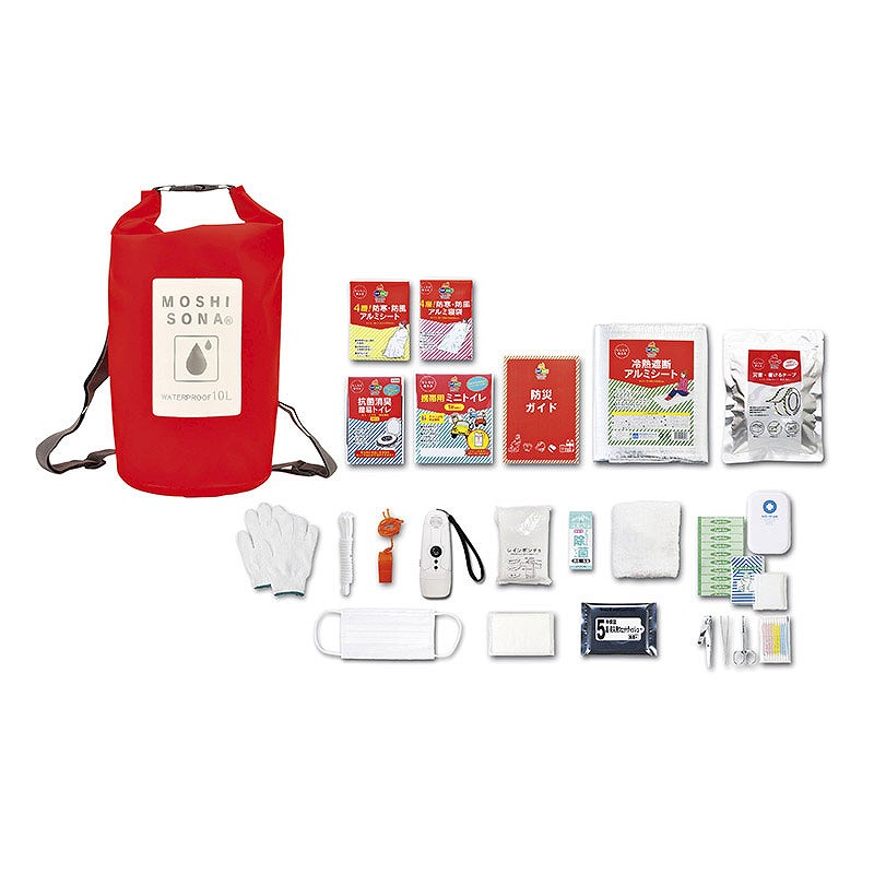 セット内容:(1)防水deリュック、(2)4層!アルミシート、(3)4層!アルミ寝袋、(4)抗菌消臭・簡易トイレ、(5)携帯用ミニトイレ、(6)防災ガイド、(7)冷熱遮断アルミシート、(8)災害・書けるテープ、(9)軍手、(10)ロープ、(11)笛、(12)スマホ対応ダイナモFMラジオLEDライト(※?)、(13)レインポンチョホワイト、(14)除菌ジェル、(15)タオル、(16)マスク、(17)ポケットティッシュ、(18)防災用ウェットティッシュ(20枚入)、(19)絆創膏5枚、(20)綿棒10P、?コットンパフ3枚、?ワンタッチ包帯、?爪切り、?毛抜き、?ハサミ(※?)携帯電話充電器機能は、スマートフォン、iPhone 対応可(一部未対応機種あり)。スマートフォン、iPhone のケーブルは付属しておりません。