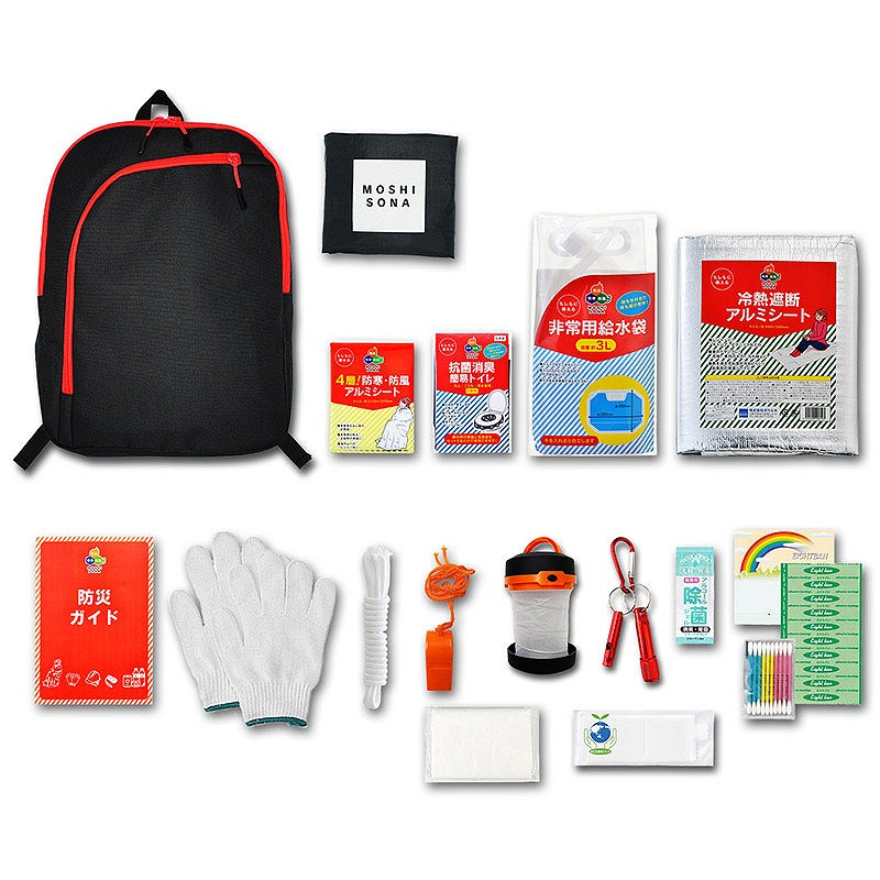 セット内容:(1)デイバッグ、(2)レインカバー、(3)4層!防寒・防風アルミシート、(4)抗菌消臭簡易トイレ、(5)非常用給水袋3L、(6)冷熱遮断アルミシート、(7)防災ガイド、(8)軍手、(9)ロープ、(10)笛、(11)飛び出せ!ランタン(単3電池×3本使用 別売)、(12)アルミLEDライト&ホイッスル(3色アソート)、(13)除菌ジェル、(14)ポケットティッシュ、(15)eco便利バッグ、(16)絆創膏5枚、(17)綿棒10P
