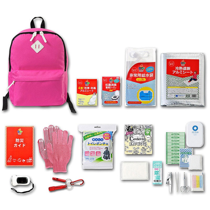 セット内容:(1)デイバッグ、(2)4層!防寒・防風アルミシート、(3)抗菌消臭・簡易トイレ、(4)非常用給水袋3 L、(5)冷熱遮断アルミシート、(6)防災ガイド、(7)パステルカラー軍手、(8)あんしんトイレポンチョ(ポーチ付)、(9)ソーラー&ダイナモLEDライト(3色アソート)、(10)アルミLEDライト&ホイッスル(3色アソート)、(11)生理用品10枚入、(12)ポケットティッシュ、(13)除菌ジェル、(14)絆創膏5枚、(15)綿棒10P、(16)コットンパフ3枚、(17)ワンタッチ包帯、(18)爪切り、(19)毛抜き、(20)ハサミ