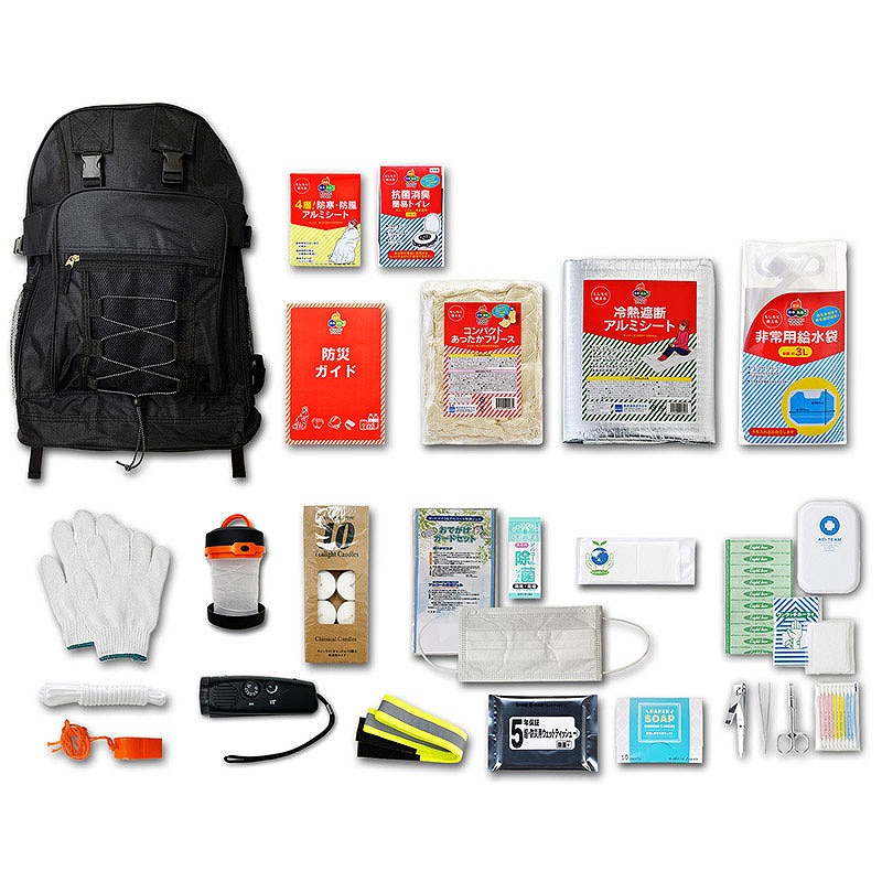 セット内容:(1)大容量リュック、(2)4層!防寒・防風アルミシート、(3)抗菌消臭・簡易トイレ、(4)防災ガイド、(5)コンパクトあったかフリース、(6)冷熱遮断アルミシート、(7)非常用給水袋3L、(8)軍手、(9)ロープ、(10)笛、(11)飛び出せ!ランタン、(12)ティーライトキャンドル10P、(13)ラジオdeライト(単4電池×3本使用 別売)、(14)除菌ジェル、(15)マスク、(16)eco便利バッグ、(17)新反射安全タスキ、(18)防災用ウェットティッシュ(20枚入)、(19)ペーパーソープ(10枚入)、(20)絆創膏5枚、?綿棒10P、?コットンパフ3枚、?ワンタッチ包帯、?爪切り、?毛抜き、?ハサミ