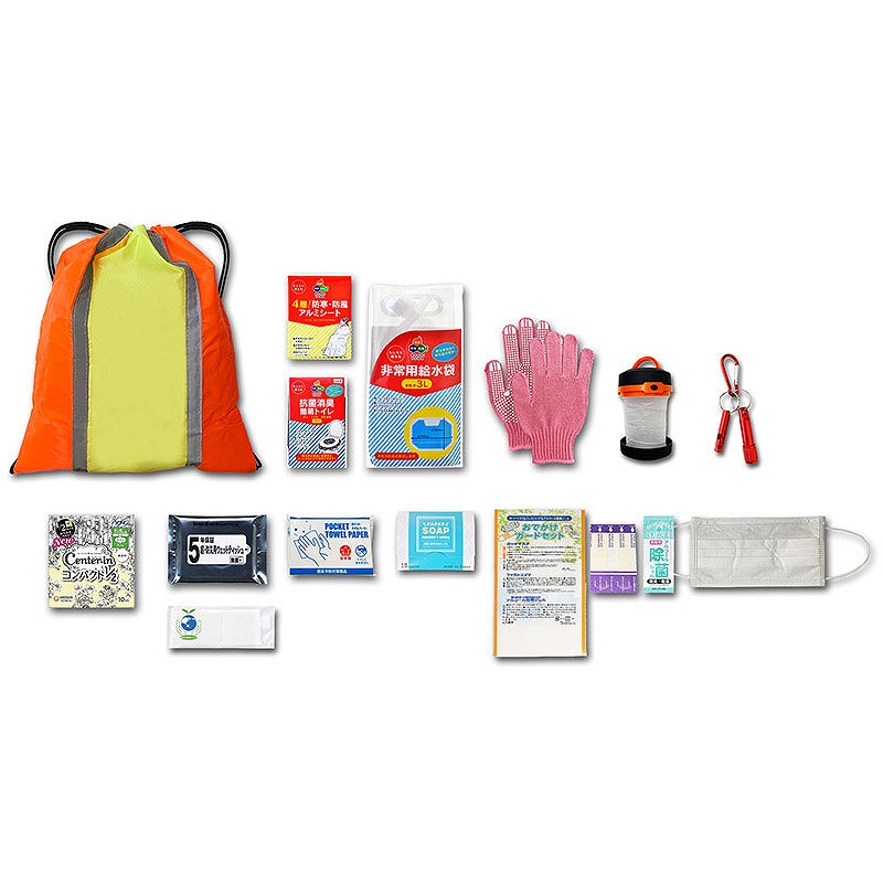 セット内容:(1)蛍光リュックバッグ、(2)4層!防寒・防風アルミシート、(3)抗菌消臭・簡易トイレ、(4)非常用給水袋3L、(5)パステルカラー軍手、(6)飛び出せ!ランタン(単3電池×3本使用 別売)、(7)アルミLEDライト&ホイッスル(3色アソート)、(8)生理用品10枚入、(9)防災用ウェットティッシュ(20枚入)、(10)eco便利バッグ、(11)ポケットタオルペーパー10枚、(12)ペーパーソープ(10枚入)、(13)絆創膏2枚、(14)除菌ジェル、(15)マスク