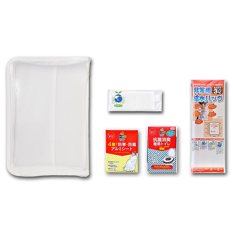 セット内容:(1)A4ジッパーファイル、(2)eco便利バッグ、(3)4層!防寒・防風アルミシート、(4)抗菌消臭・簡易トイレ、(5)非常用給水バッグ3L