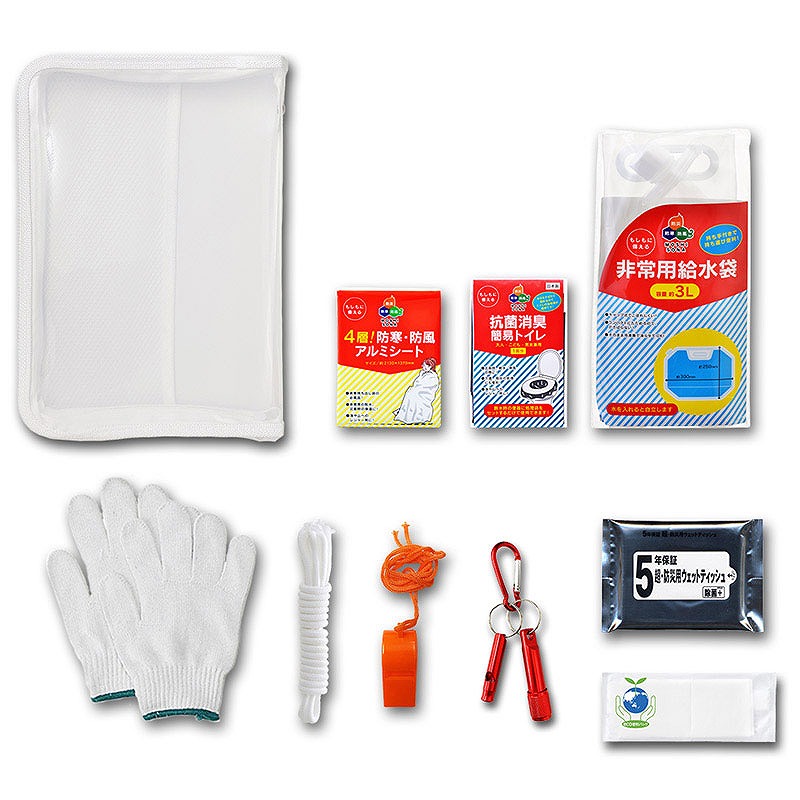 セット内容:(1)A4ジッパーファイル、(2)4層!防寒・防風アルミシート、(3)抗菌消臭・簡易トイレ、(4)非常用給水袋3L、(5)軍手、(6)ロープ、(7)笛、(8)アルミLEDライト&ホイッスル(3色アソート)、(9)防災用ウェットティッシュ(20枚入)、(10)eco便利バッグ