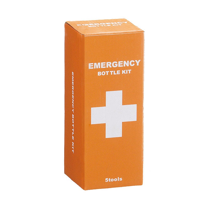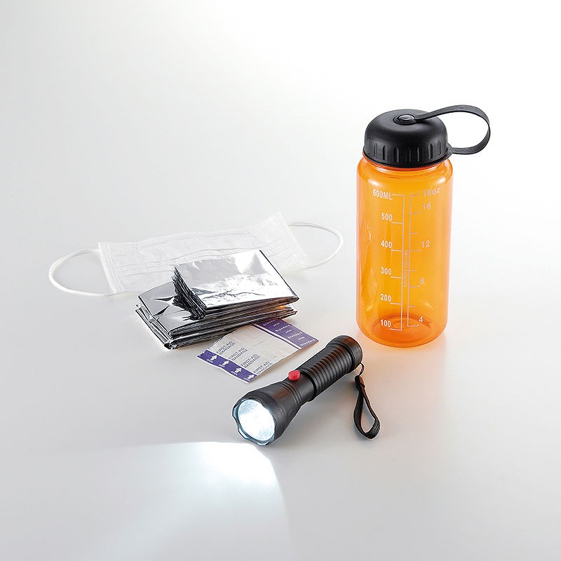 セット内容:(1)ウォーターボトル(満水容量690ml)、(2)LED懐中電灯(単4電池×3本使用/別売)、(3)防寒用アルミシート、(4)マスク、(5)救急絆創膏2枚(国産)※医療機器届出番号 43B2X10001000030